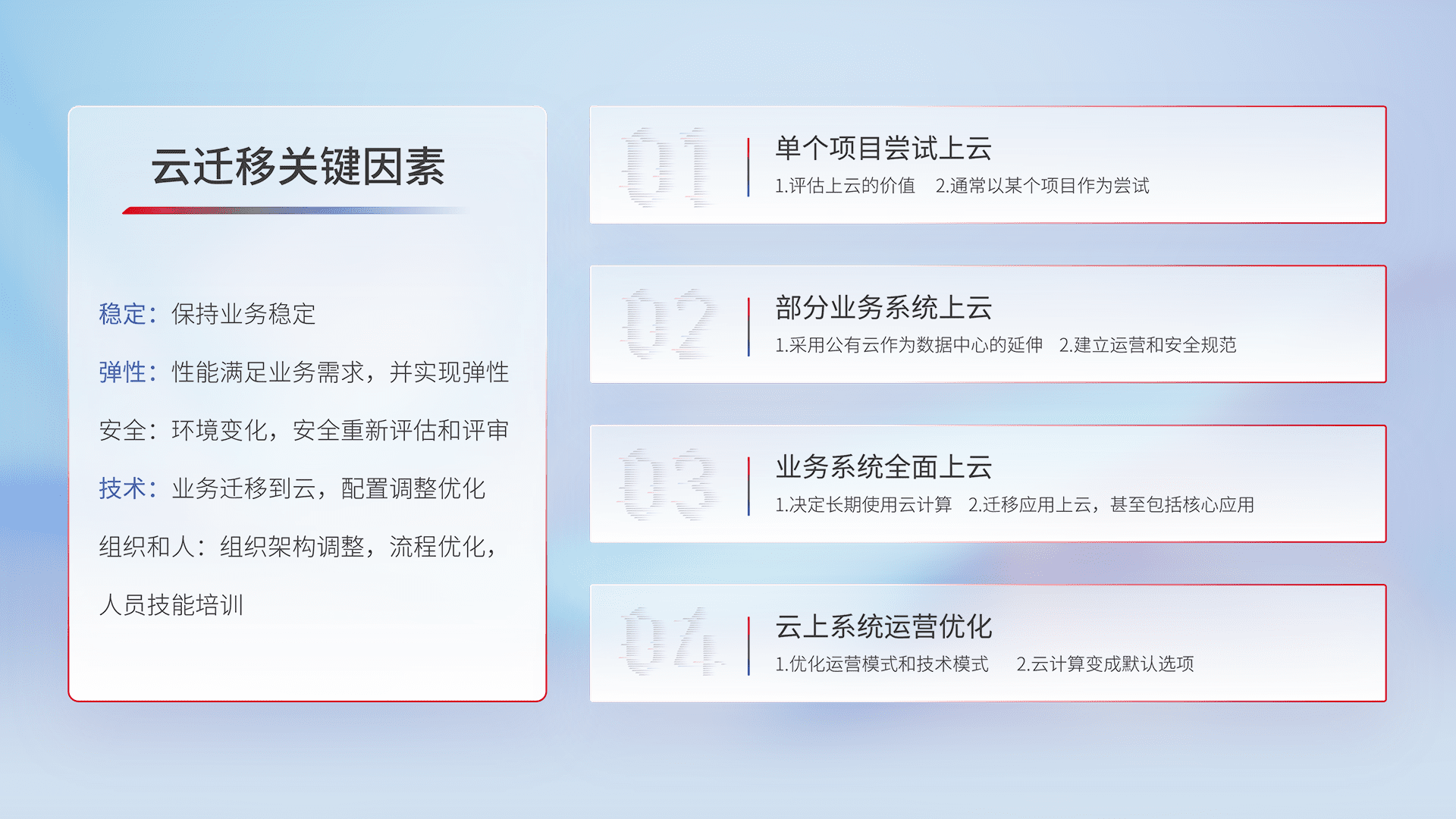 结合实际业务,,,从规划设计、、、、云平台选型、、、、云原生改造、、、、数据迁移、、集成交付,,迁移全过程为客户识别最佳上云路径,,,做好风险识别管理,,,,设计网络架构、、身份权限、、、、安全审计合规、、操作审计、、日志审计、、、监控告警策略、、、多站点容灾设计等,,,,对云上基础设施进行整体规划,,提升IT治理水平,,以满足弹性、、高可用、、、、高性能的需求。。。。