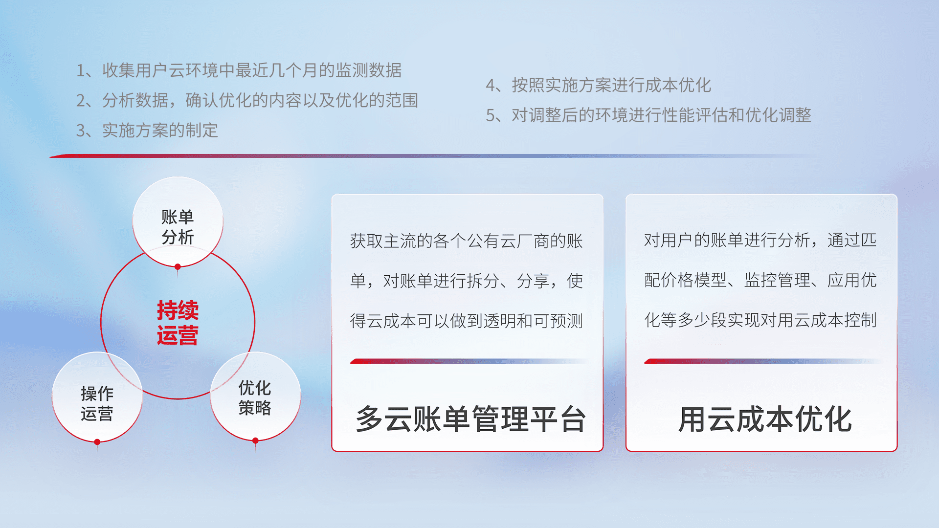 通过多云纳管,,,以统一的资源数据模型把客户的云资源进行抽象和封装,,进而实现对多云资源的统一操作,,,,保障云资源管理的可靠性、、、、稳定性与可用性。。。量身定制化运维内容,,,,配置、、、、开发运维、、补丁管理、、、备份、、、监控、、、、认证和访问管理、、、审计和日常巡检等,,,保障在用云过程中的可靠度,,,稳定度以及高可用率。。。